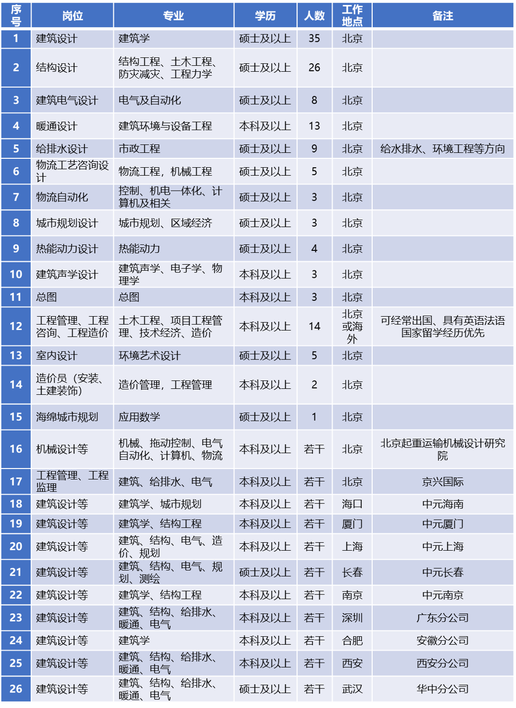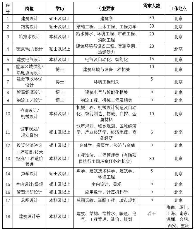 根據公司業務發展需要,現誠邀2020屆優秀畢業生加盟:序號崗位專業學歷人數工作地點備注1建筑設計建筑學碩士及以上13北京2結構設計結構工程、土木工程、防災減災、工程力學碩士及以上21北京3建筑電氣設計電氣及自...