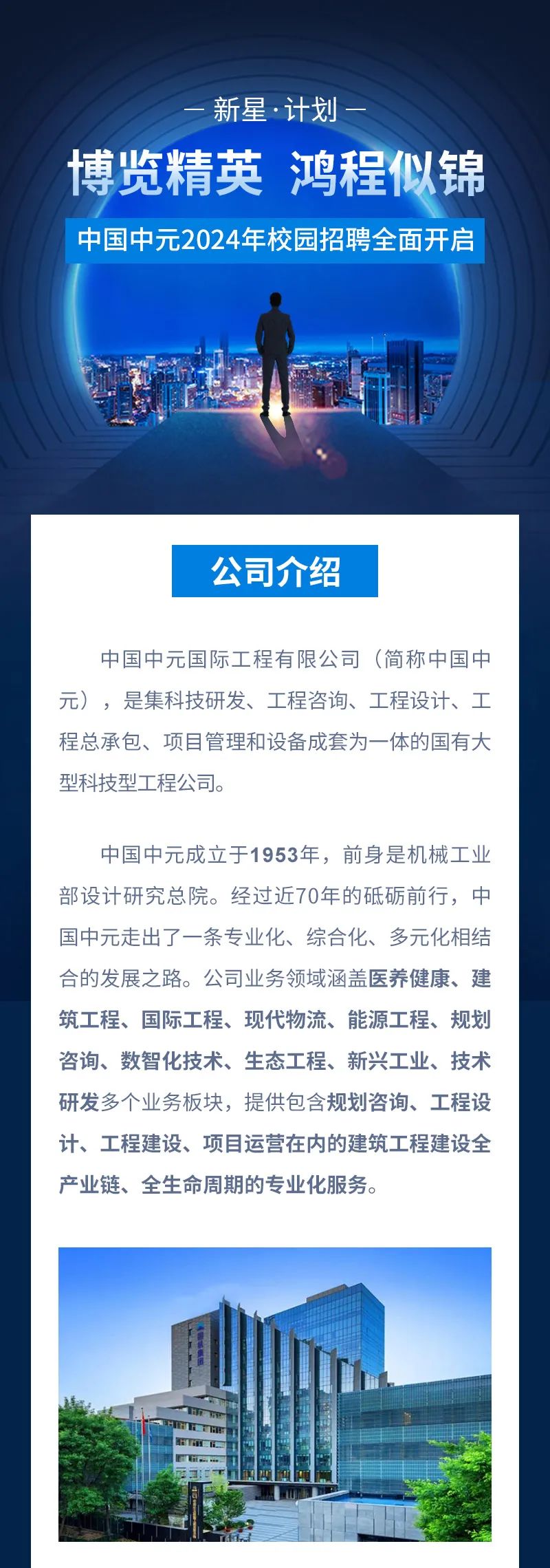 加入中元點亮屬于你的榮耀新星尋找新的自己未來由你掌握我們有多元的職場福利豐厚的生活保障貼心的健康守護在中元舞臺比想象更大也因為你才有更大舞臺你就是我們在找的“新星”公司介紹:中國中元國際工程有限公司...