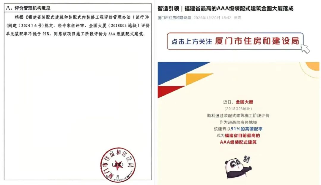 近日,由中國中元、中元(廈門)聯合設計的金圓大廈獲評AAA級裝配式建筑。本項目作為超高層商務地標,憑借91%的高裝配率,成為福建省首棟200米以上超高層AAA裝配式建筑。廈門市住房和建設局官方發文點贊宣傳。